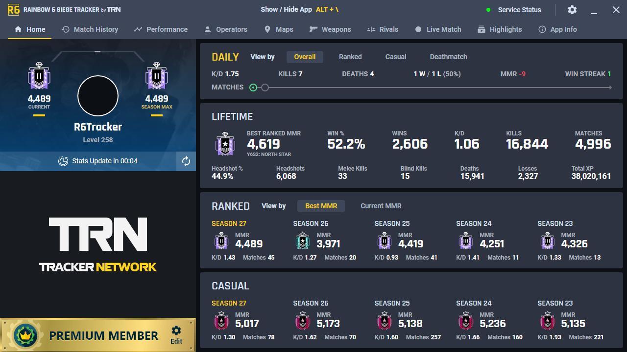 R6 Tracker Network is usually the first name that comes to mind, and it’s free to use. It has earned that reputation through years of consistent updates, a clean interface, and comprehensive data coverage across all platforms. PC, PlayStation, and Xbox players can all access their statistics, though PC users enjoy the fullest experience through the Overwolf-powered desktop overlay.