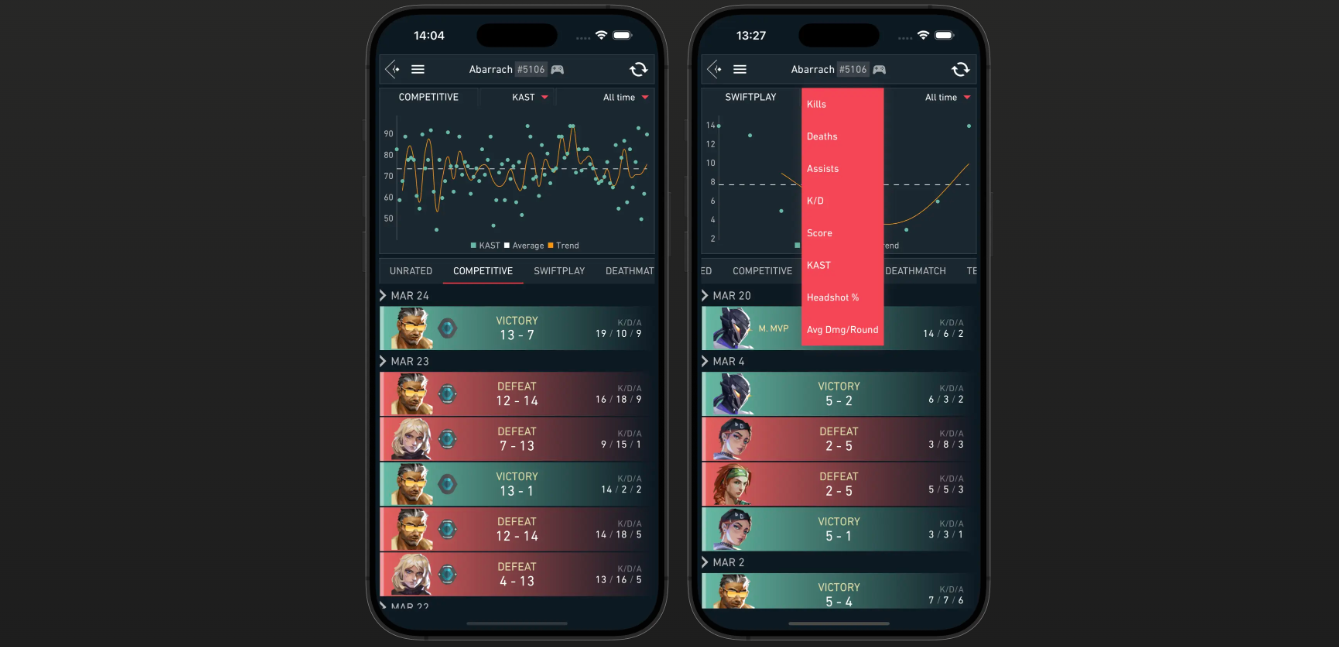 Not everyone wants to run another desktop application. Spike Stats fills that gap with a polished mobile app for iOS and Android that lets you check your Valorant stats on the go. Match history, KDA breakdowns, weapon statistics, and round-by-round insights are all available from your phone.
