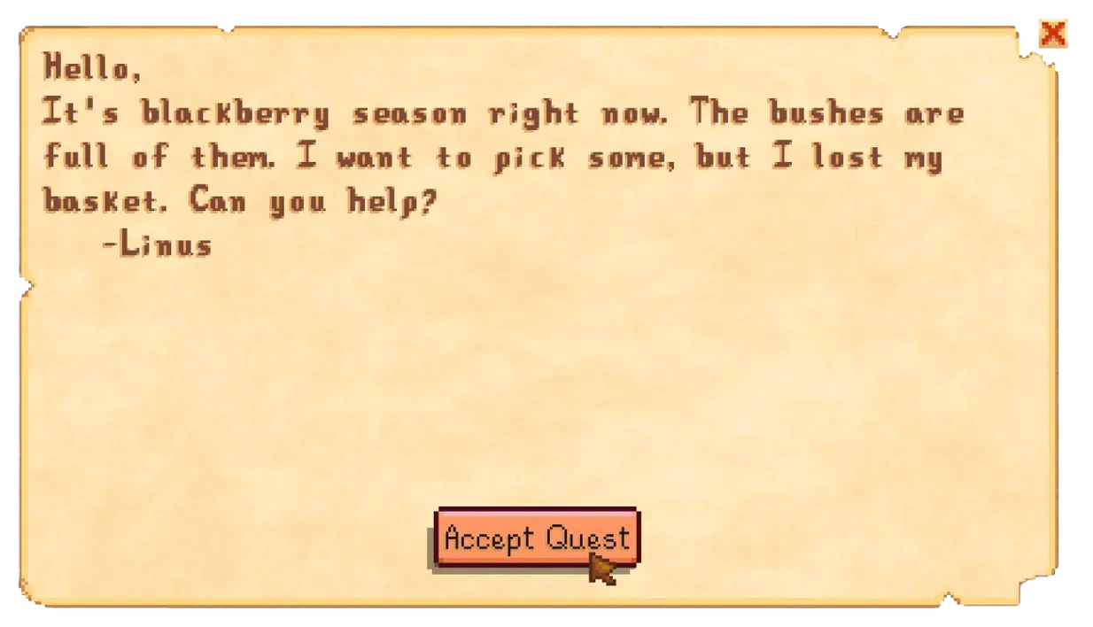 On the 8th day of Fall in your first year, you’ll receive a letter from Linus saying that it’s blackberry season, but he’s lost his basket, and he’s asking for your help to find it. Regardless of your friendship level or relationship with him, every player will get this quest.