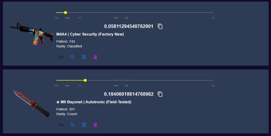 | Factory New | 0.01 - 0.07 | Item is in perfect condition with fine detail and vibrant colors. Most valuable among skins. |